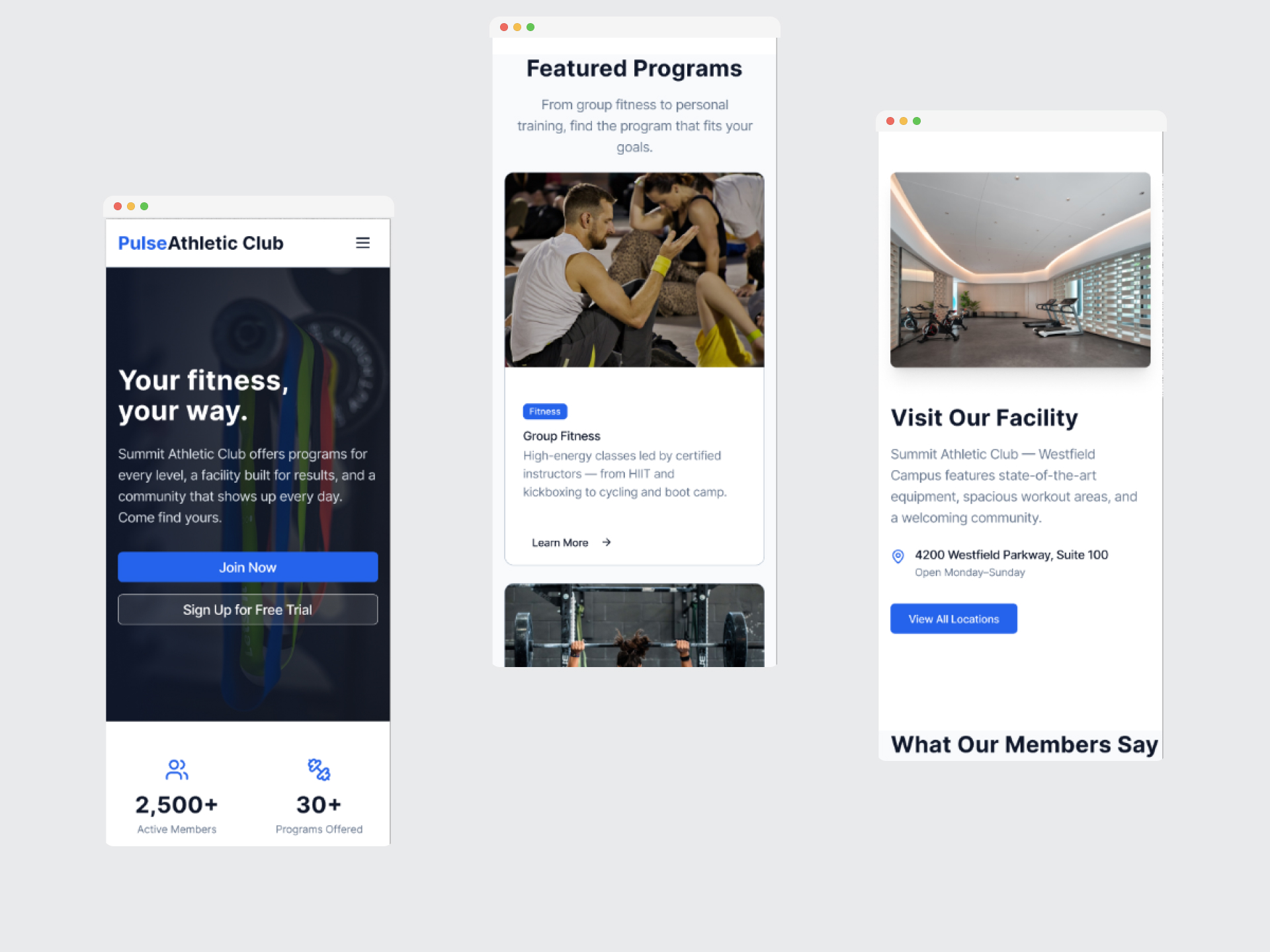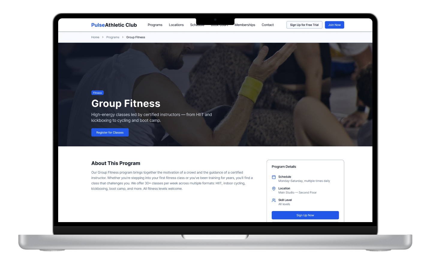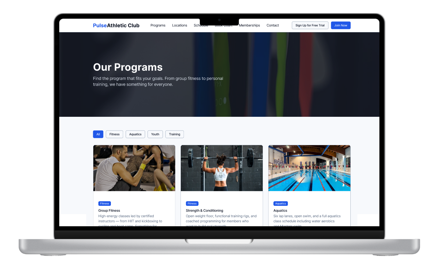 Pulse Athletic Club Theme is built for swim clubs, aquatic centers, and country clubs with pool amenities. It features rich imagery layouts and intuitive navigation to showcase your facilities and programs.