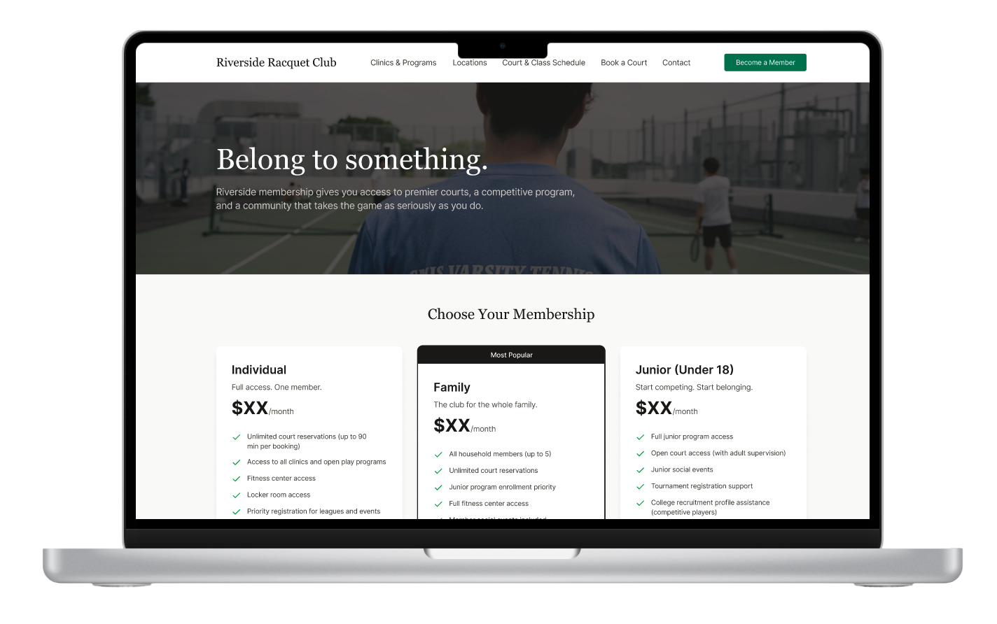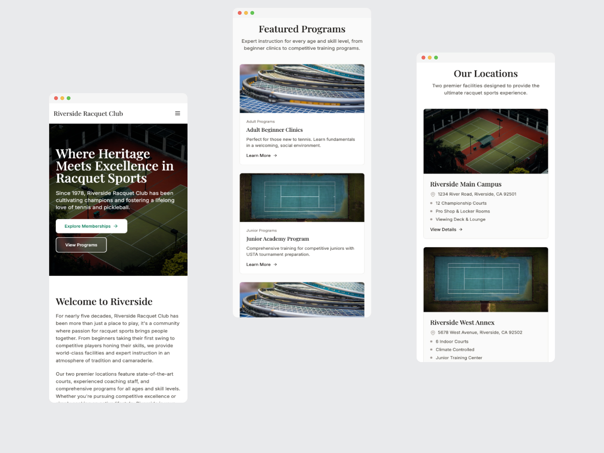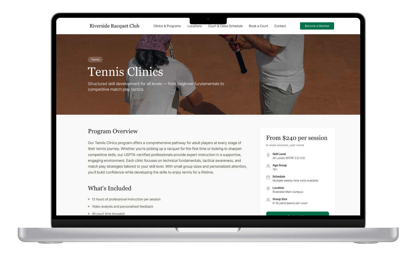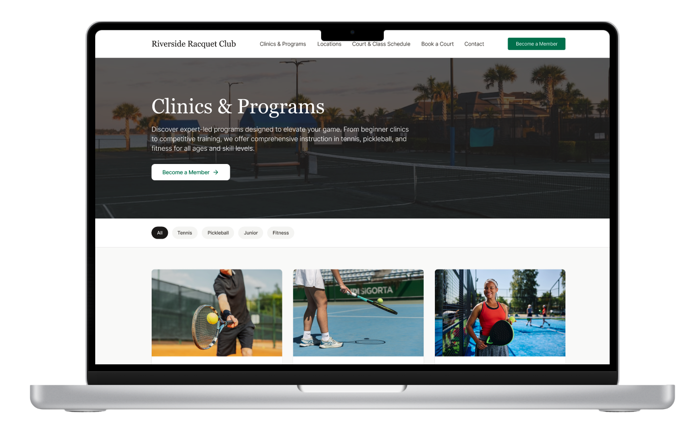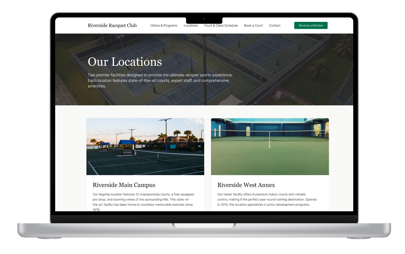 Riverside Raquet Club Theme brings a serene, spa-like aesthetic to your club's website. With calming colors, generous whitespace, and smooth interactions, it creates a peaceful digital experience for your members.