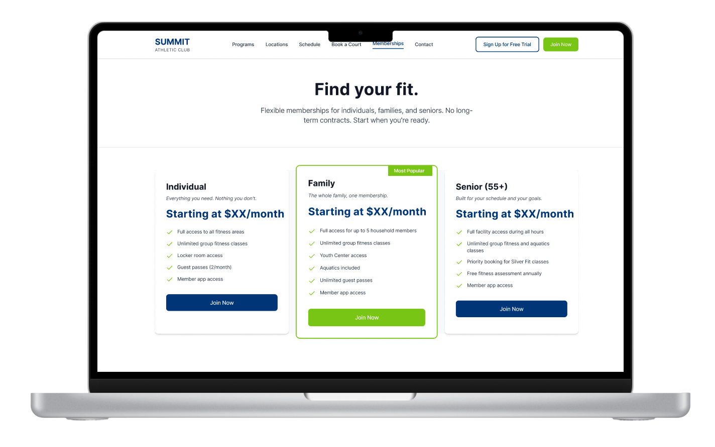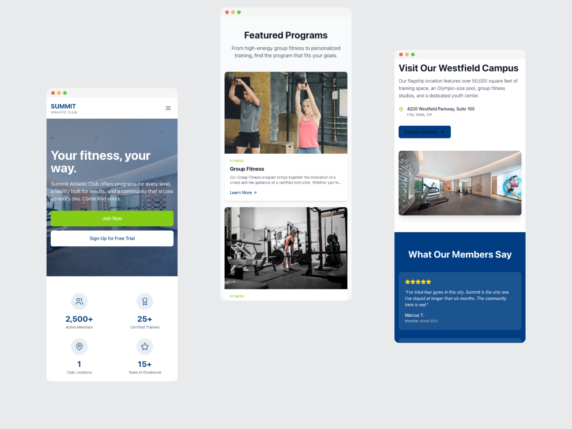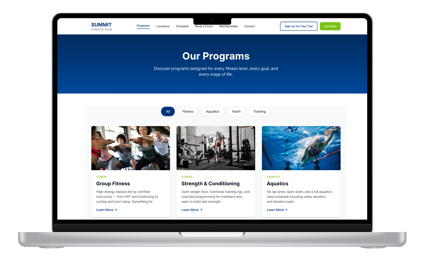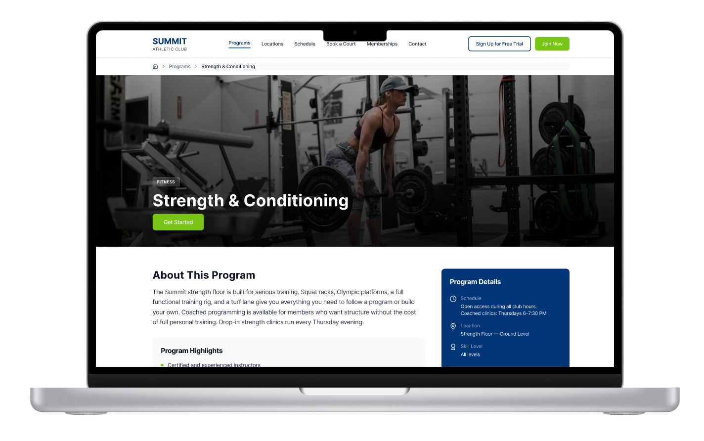 Summit Athletic Club Theme is crafted for tennis clubs, racquet sports centers, and multi-sport facilities. Bold layouts and dynamic imagery help showcase your courts, programs, and competitive events.